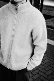 毛足の長いモヘヤアルパカ糸に、起毛加工をほどこしたジップアップニット。